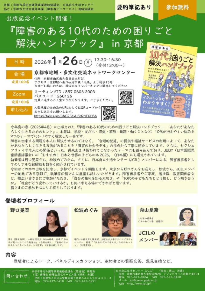 | 日本自立生活センター 〒601-8036京都市南区東九条松田町28メゾングラース京都十条101 TEL:075-671-8484 FAX:075-671-8418 |