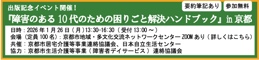 出版記念イベント開催!です。 『障害のある10代のための困りごと解決ハンドブック』in 京都 詳しくはこちら(文字情報) ちらしはこれ(画像) ワークスではオリジナルカレンダーを販売しています。詳しくはここから |